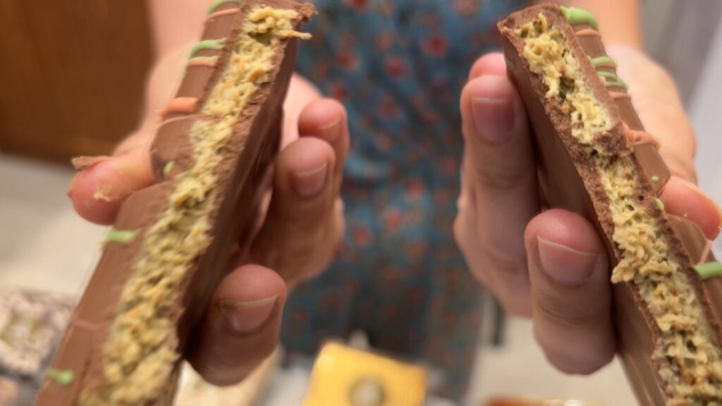 Su propuesta es crujiente por fuera, gracias a la pasta kataïfi, y muy cremosa por dentro. Es un chocolate cara que puede llegar a costar 13 euros la baldosa, dependiendo del tamaño, y por eso preguntamos a la Bea si realmente se lo vale: "Hay que tener buen producto. Y sí, es exclusivo. Sobre todo por los ingredientes: piensa que está hecho con pasta de pistacho. El pistacho es un producto muy caro y también contiene chocolate con leche que también es cara".